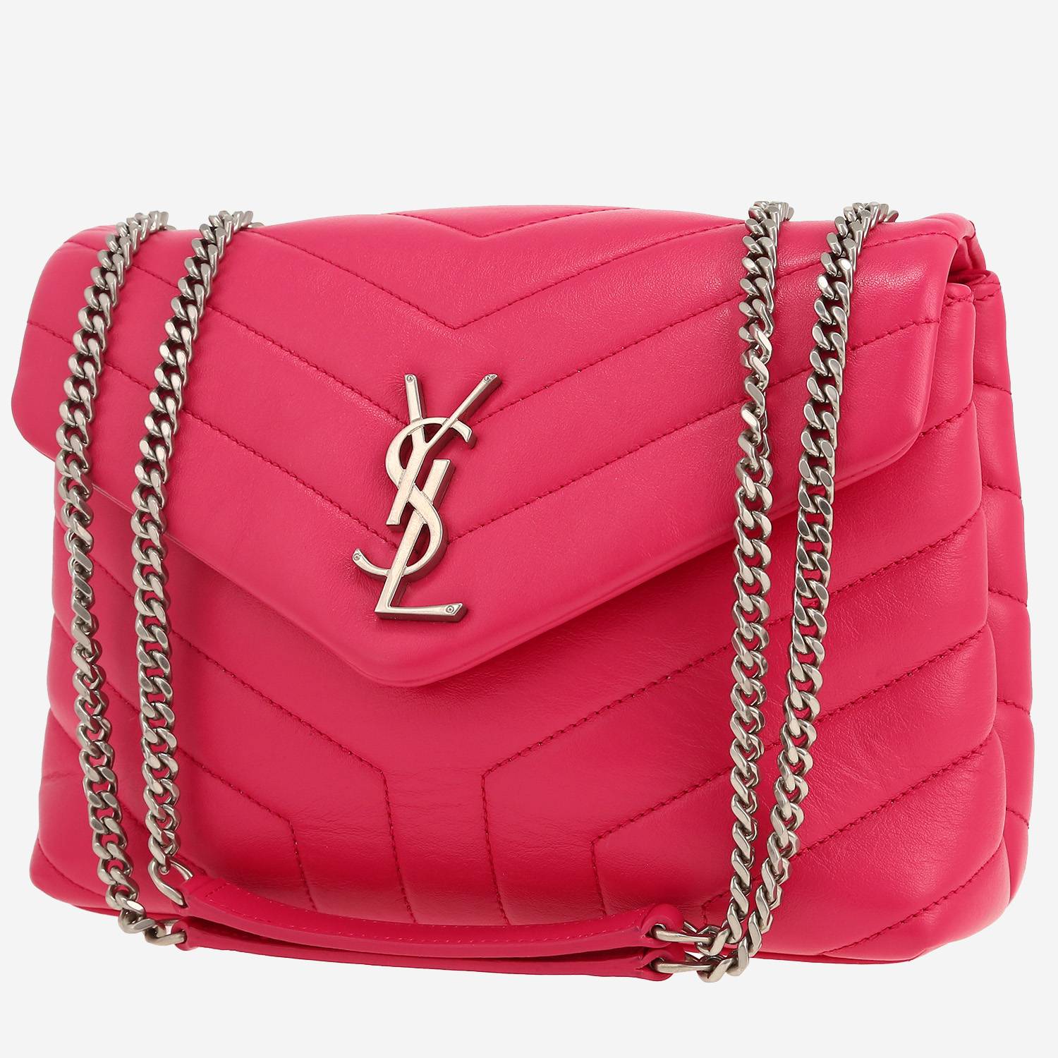 Magnifique sac bandoulière Saint Laurent Loulou petit modèle en cuir matelassé chevrons rose, garniture en métal argenté, une anse-chaine transformable en métal argenté permettant un porté épaule ou bandoulière.