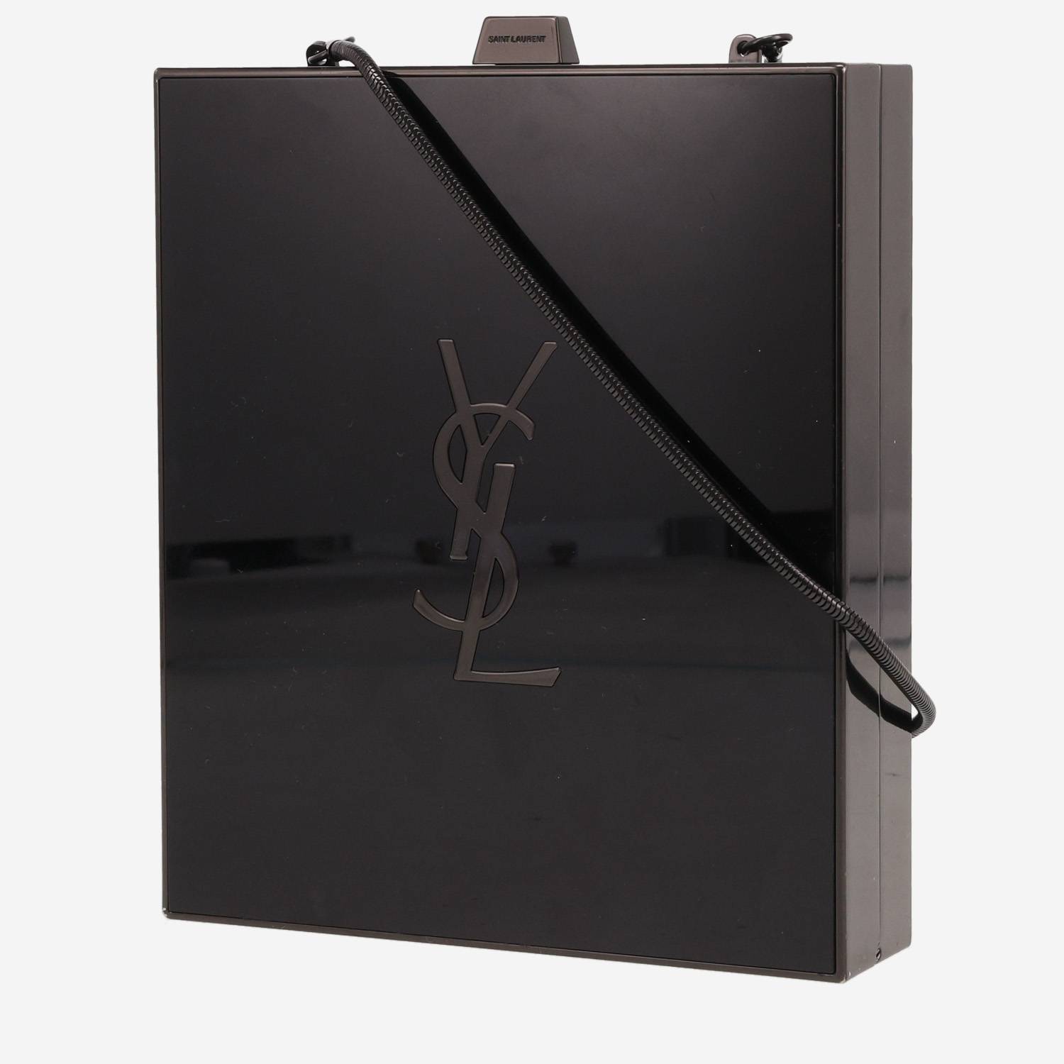 Superbe minaudière Saint Laurent en plexiglas noir, garniture en métal noirci, une anse simple en métal noirci permettant un porté main ou épaule ou bandoulière.