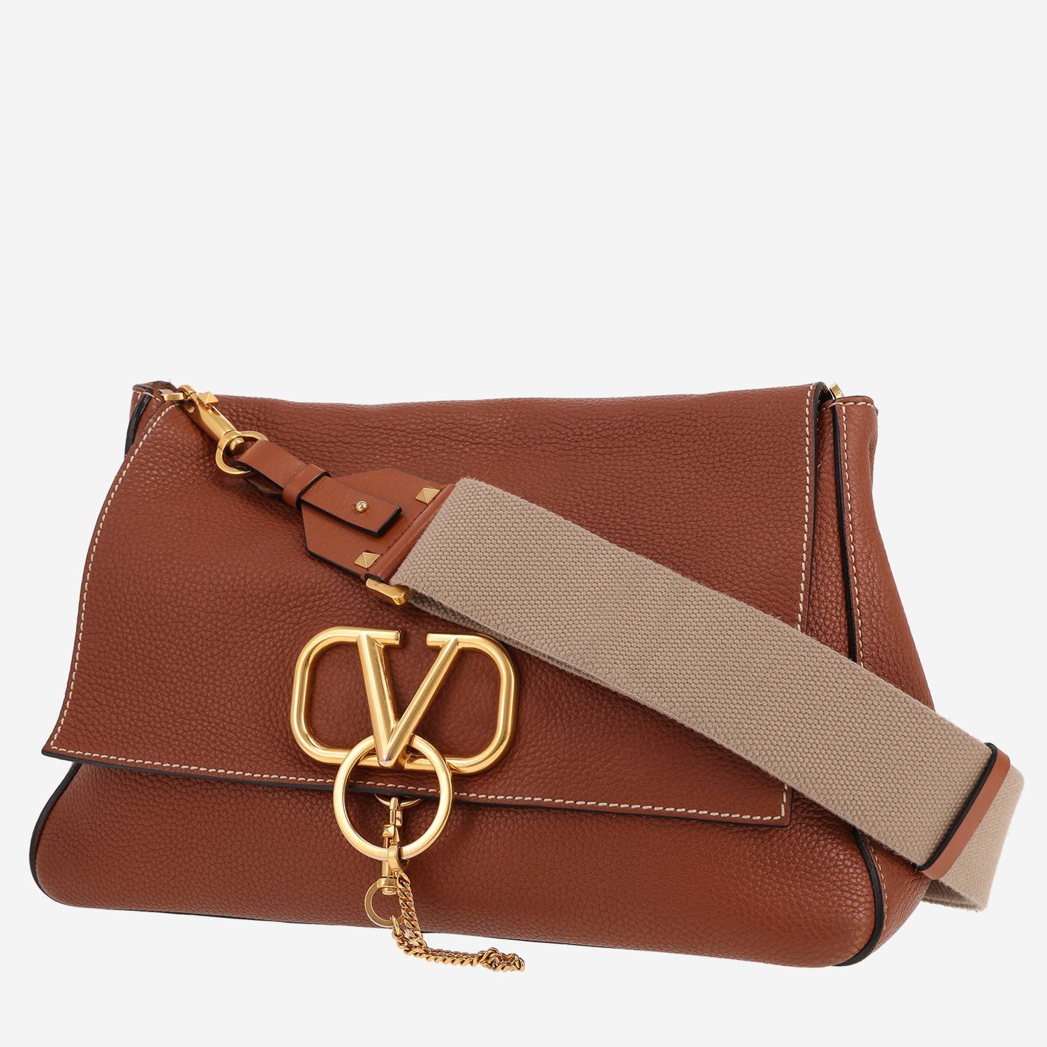 Magnifique sac à main Valentino Garavani Vlogo en cuir grainé marron, garniture en métal doré, une anse bandoulière amovible réglable en toile beige permettant un porté épaule ou bandoulière.