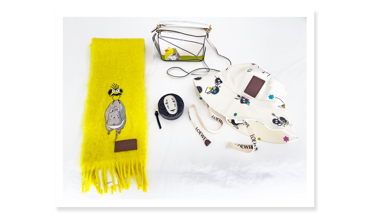 Item(s): All from Loewe x Spirited Away… Yu-bird & Boh scarf, Otori Mini Puzzle, Kaonashi Cookie Pouch, and a Susuwatari fisherman hat.